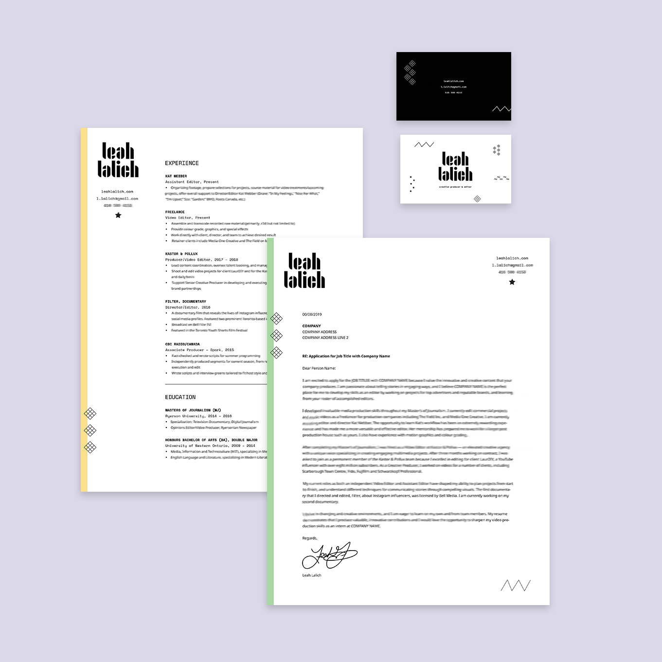 Designed brand identity for creative producer and video editor Leah Lalich.